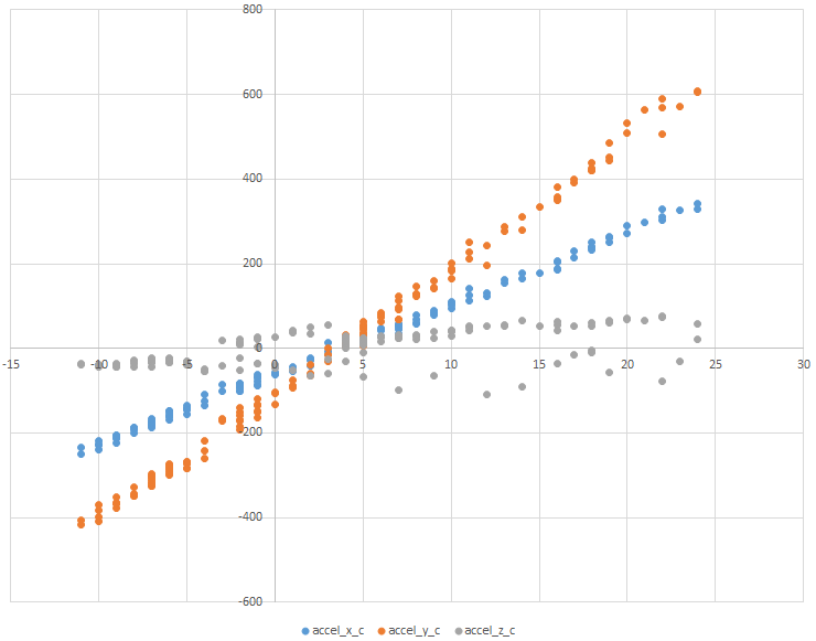NT-ARS 센서에 온도를 올리고 내리는 실험을 통해 온도 변화에 따른 출력 데이터를 모으고 이를 엑셀의 그래프로 그려 보았습니다. 데이터가 원점 근처에 모여있는것은, 온도에서 25도를 빼고 센서 출력 데이터에서도 평균을 빼서 그래프를 그렸기 때문입니다. 가속도 센서의 데이터(accl_x_c, accl_y_c, accl_z_c)가 각속도 센서의 데이터(gyro_x_c, gyro_y_c)보다 온도 변화에 영향을 더 크게 받는 것을 볼 수 있고 그래프의 모양도 대략 선형을 띄고 있습니다. 일이 아주 쉬워질 것 같습니다. ^^